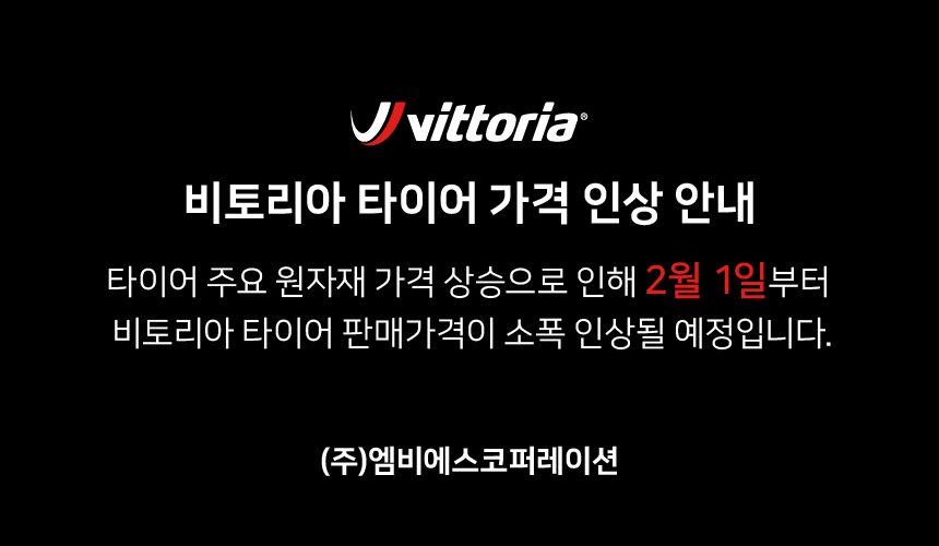 [비토리아 타이어 가격 인상 안내] 타이어 주요 원자재 가격 상승으로 인해 2월 1일부터비토리아 타이어 판매가격이 소폭 인상될 예정입니다. (주)엠비에스코퍼레이션