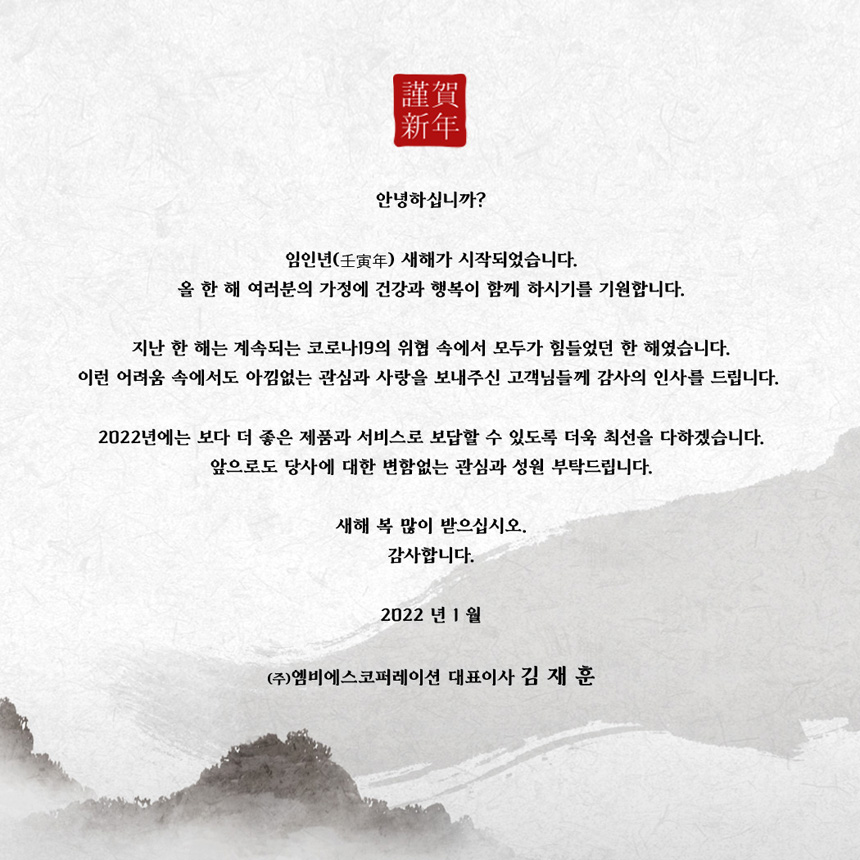 안녕하십니까? 임인년(壬寅年) 새해가 시작되었습니다. 올 한 해 여러분의 가정에 건강과 행복이 함께 하시기를 기원합니다. 지난 한 해는 계속되는 코로나19의 위협 속에서 모두가 힘들었던 한 해였습니다. 이런 어려움 속에서도 아낌없는 관심과 사랑을 보내주신 고객님들께 감사의 인사를 드립니다. 2022년에는 보다 더 좋은 제품과 서비스로 보답할 수 있도록 더욱 최선을 다하겠습니다. 앞으로도 당사에 대한 변함없는 관심과 성원 부탁드립니다. 새해 복 많이 받으십시오. 감사합니다. 2022년 1월 (주)엠비에스코퍼레이션 대표이사 김 재 훈 |
