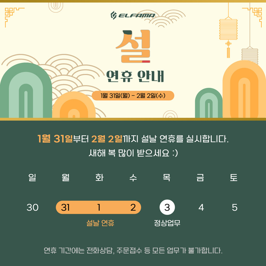 1월 31일부터 2월 2일까지 설날 연휴를 실시합니다.