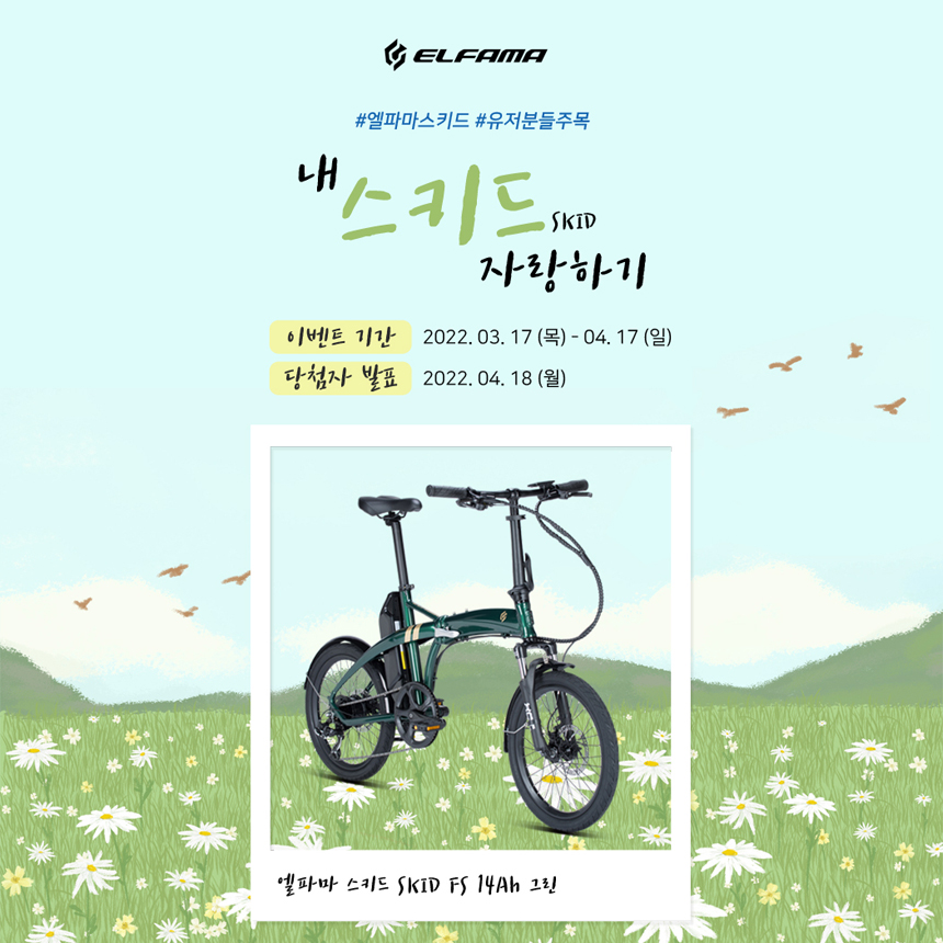 [엘파마 내 스키드(SKID) 자랑하기 인스타그램 이벤트] 엘파마 스키드 유저분들을 위한 내 스키드 자랑하기 이벤트를 진행합니다. 현재 사용 중인 엘파마 스키드(FS) 사진을 인스타그램에 올려서 자랑해 주세요. 이벤트에 참여해 주신 분 중 추첨을 통해 다양한 사은품을 드립니다 :) ▶ 이벤트 개요 · 이벤트 기간 2022년 3월 17일 ~ 4월 17일 · 당첨자 발표 2022년 4월 18일 · 이벤트 참여 방법 : ① 엘파마 인스타그램 (@elfama.kr)팔로우하기 ② 본인 소유의 엘파마 스키드 또는 스키드 FS 사진을 인스타그램에 업로드 ③ 사진에 @elfama.kr 태그하고 #엘파마스키드 #전기자전거 #내스키드자랑하기 해시태그 넣기 · 사은품 : ⊙ 작품상 2명 - 사은품 : 이마트 5만원 상품권 ⊙ 열정상 5명 - 사은품 : 스타벅스 부드러운 디저트 세트 ⊙ 감사상 13명 - 사은품 : 스타벅스 아메리카노 *이벤트 당첨된 사진은 당사의 마케팅용으로 사용될 수 있습니다. |